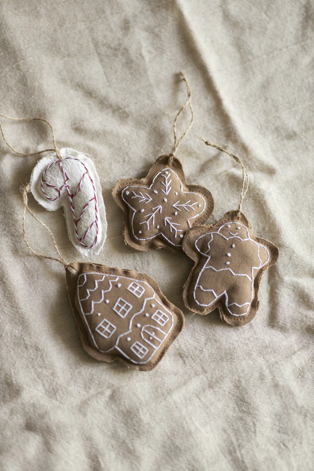 Están realizados en gabardina y lienzo, rellenos de vellón y bordados a mano. Incluyen hilo de yute para que puedas colgarlo en tu arbolito o donde quieras!