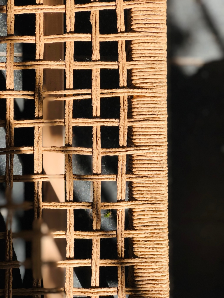 Banco de arrime o pie de cama en madera con asiento tejido en hilo kraft natural.