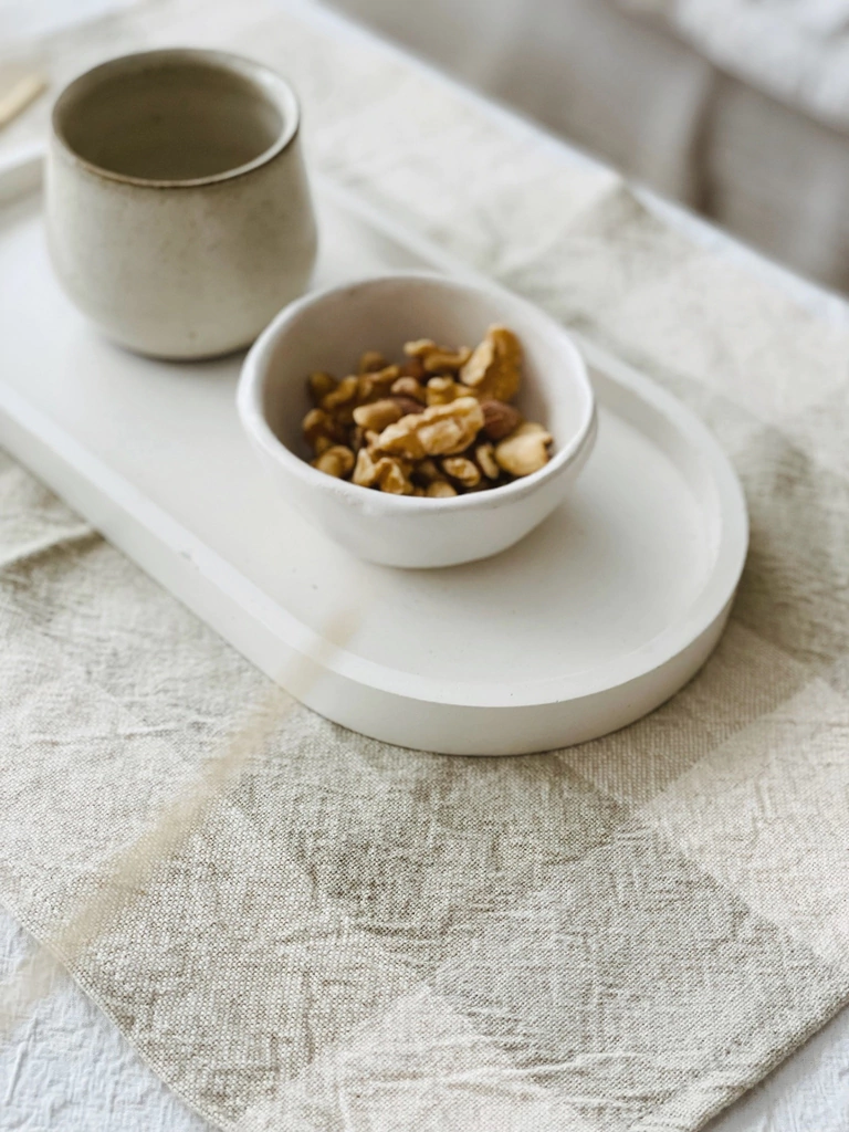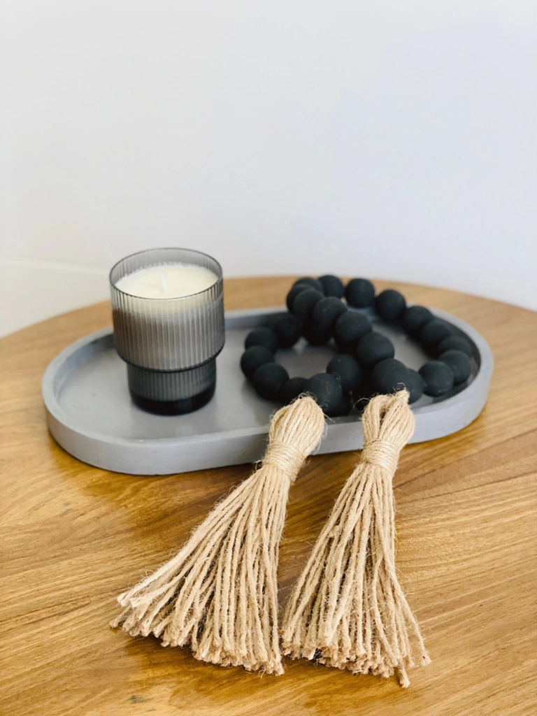 Bandeja de destaque en formato ovalado. Realizada en concreto liso y terrazo.