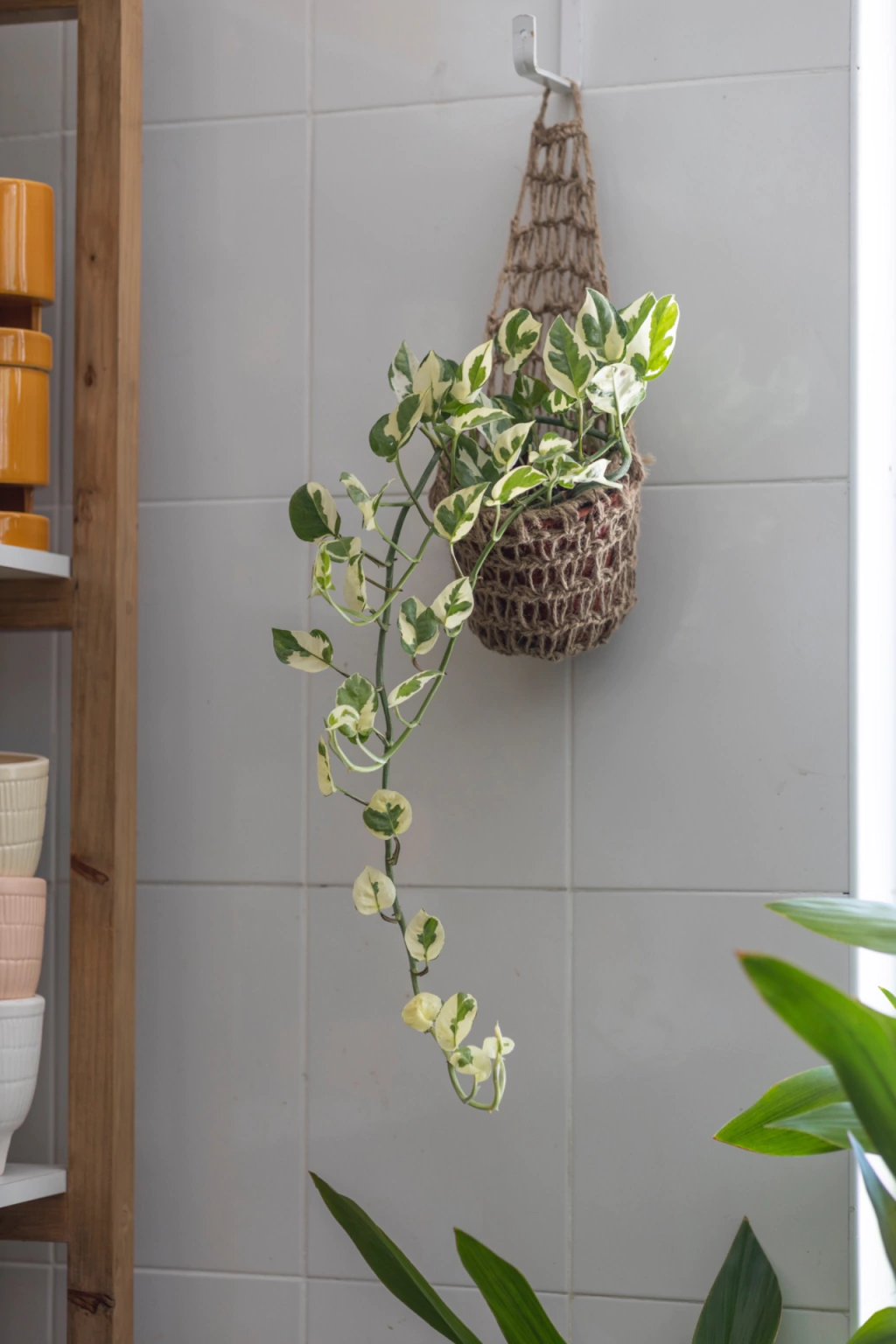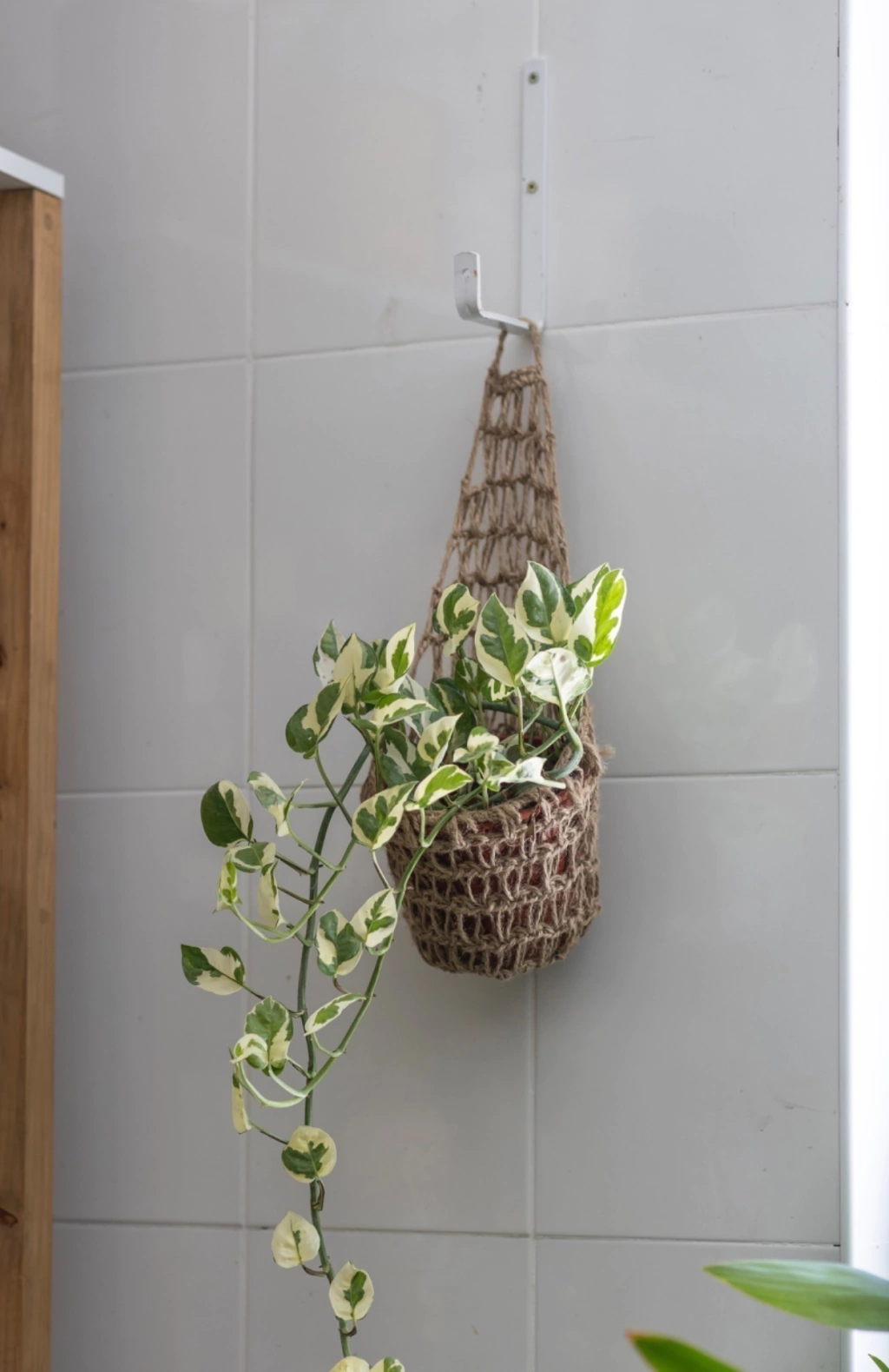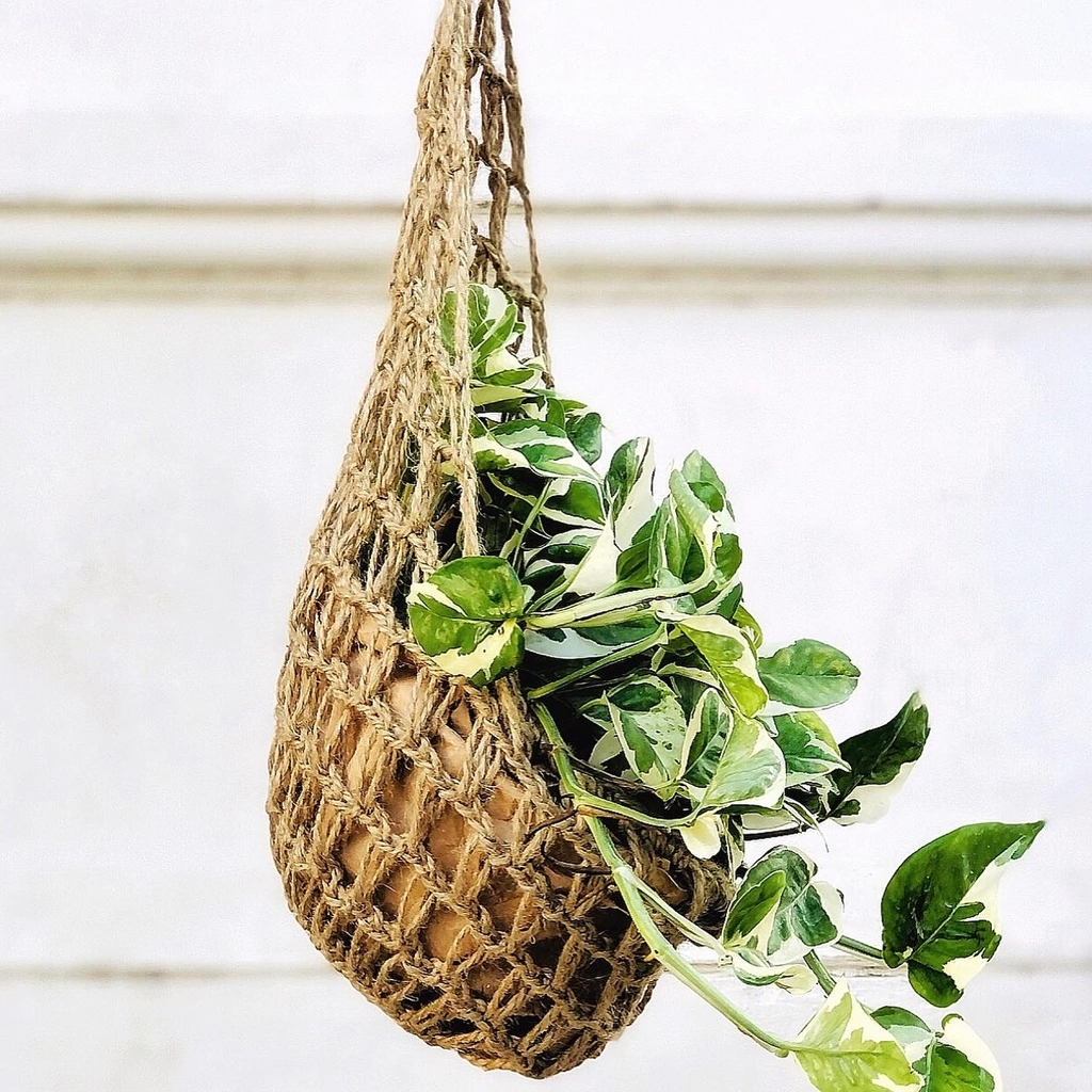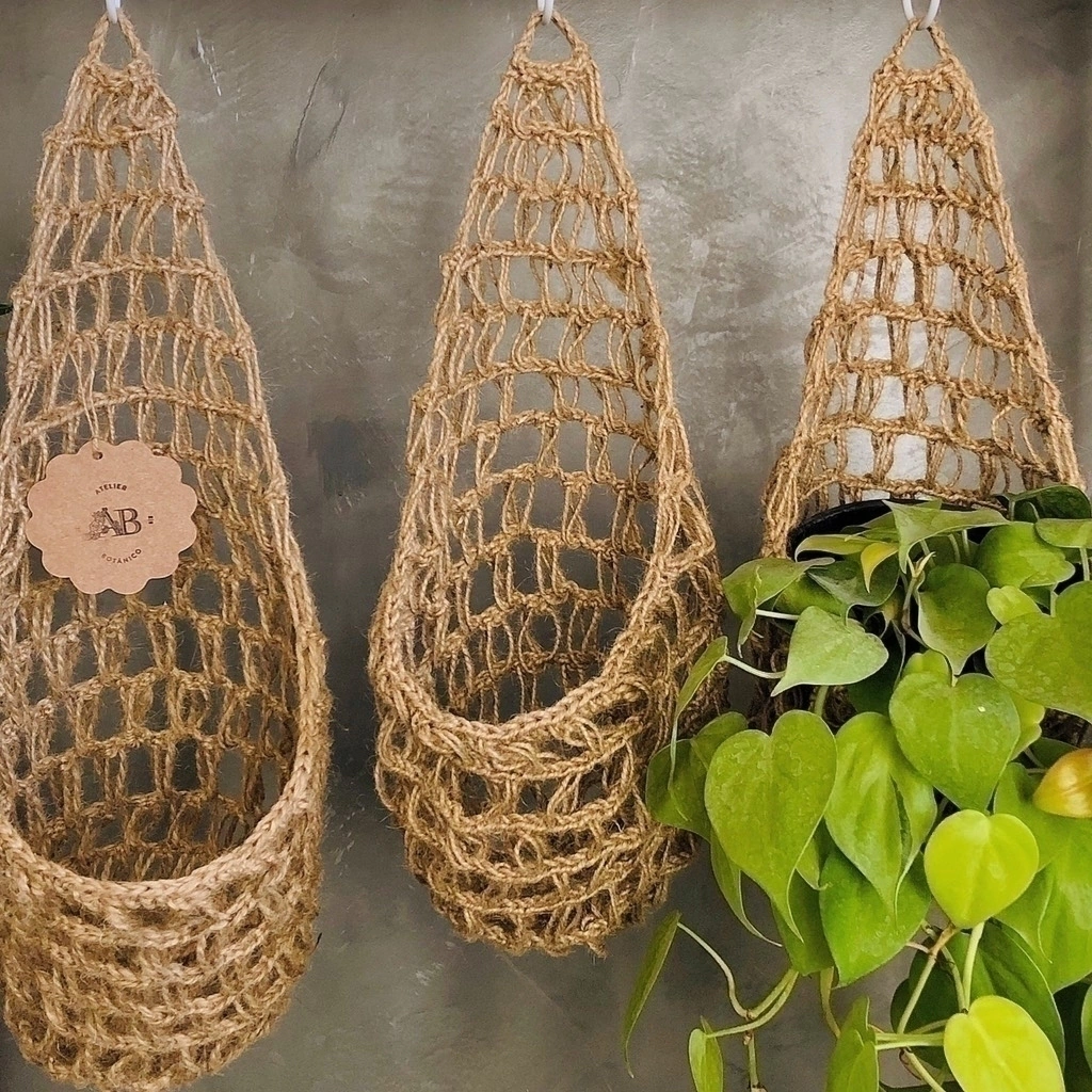 Canastos realizados a mano con la técnica macramé en hilo de yute natural. Una forma de incorporar plantas a tu casa de forma distinta, de forma colgante.