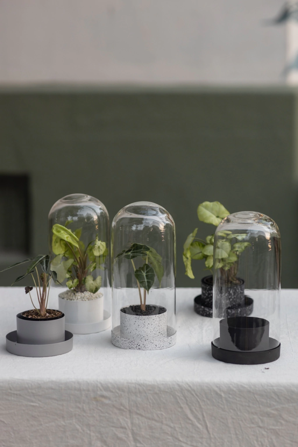 La Cúpula Gili combina vidrio y metal pintado al horno, creando un objeto decorativo que resalta la belleza de las plantas y protege su entorno. Su base metálica y maceta esmaltada incluyen orificio de drenaje, ideal para mantener un riego equilibrado. Podés elegirla con o sin plantas. Las opciones con plantas incluyen especies como alocasia amazónica, spathiphyllum, singonio, hypoestes o sansevieria enana, según disponibilidad de stock.
