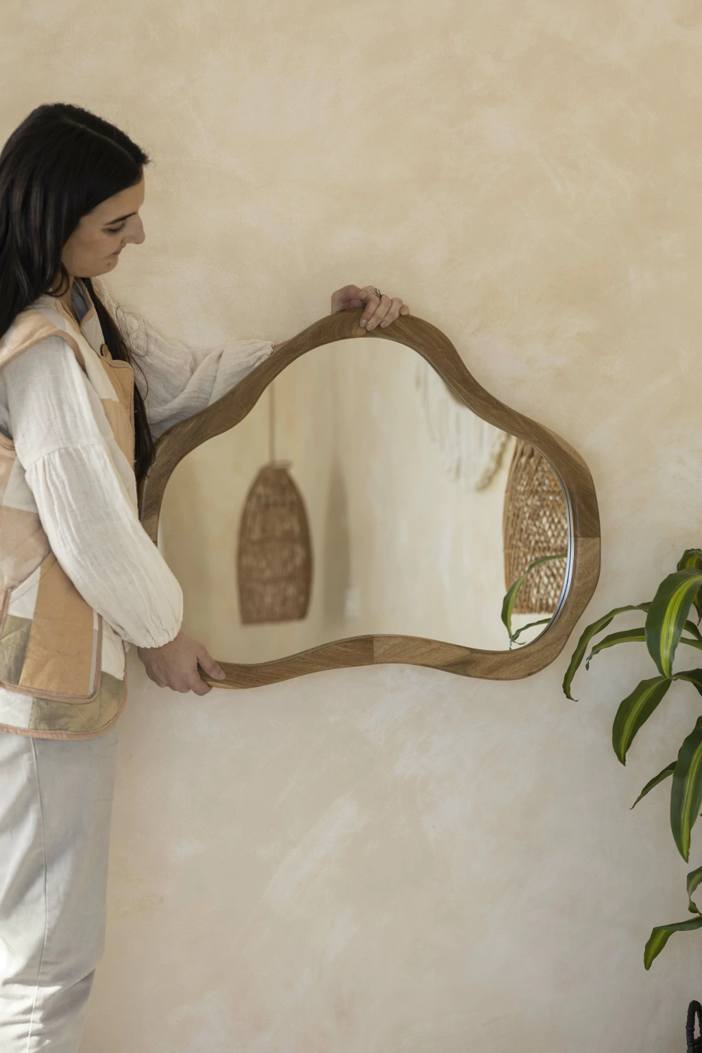 Espejo de forma orgánica con marco realizado en petiribí macizo hidrolaqueado. Es una pieza artesanal que te va a enamorar.