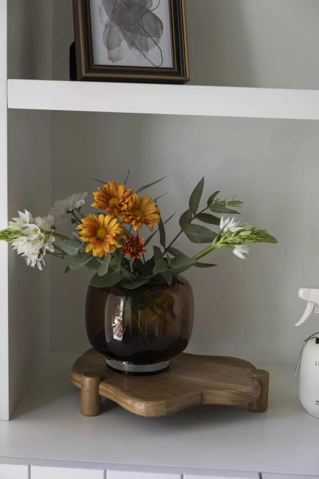 Jarrón de vidrio con forma curva en color ámbar. Ideal para ramos de flores, hojas, secos, plantas o simplemente como objeto de diseño.