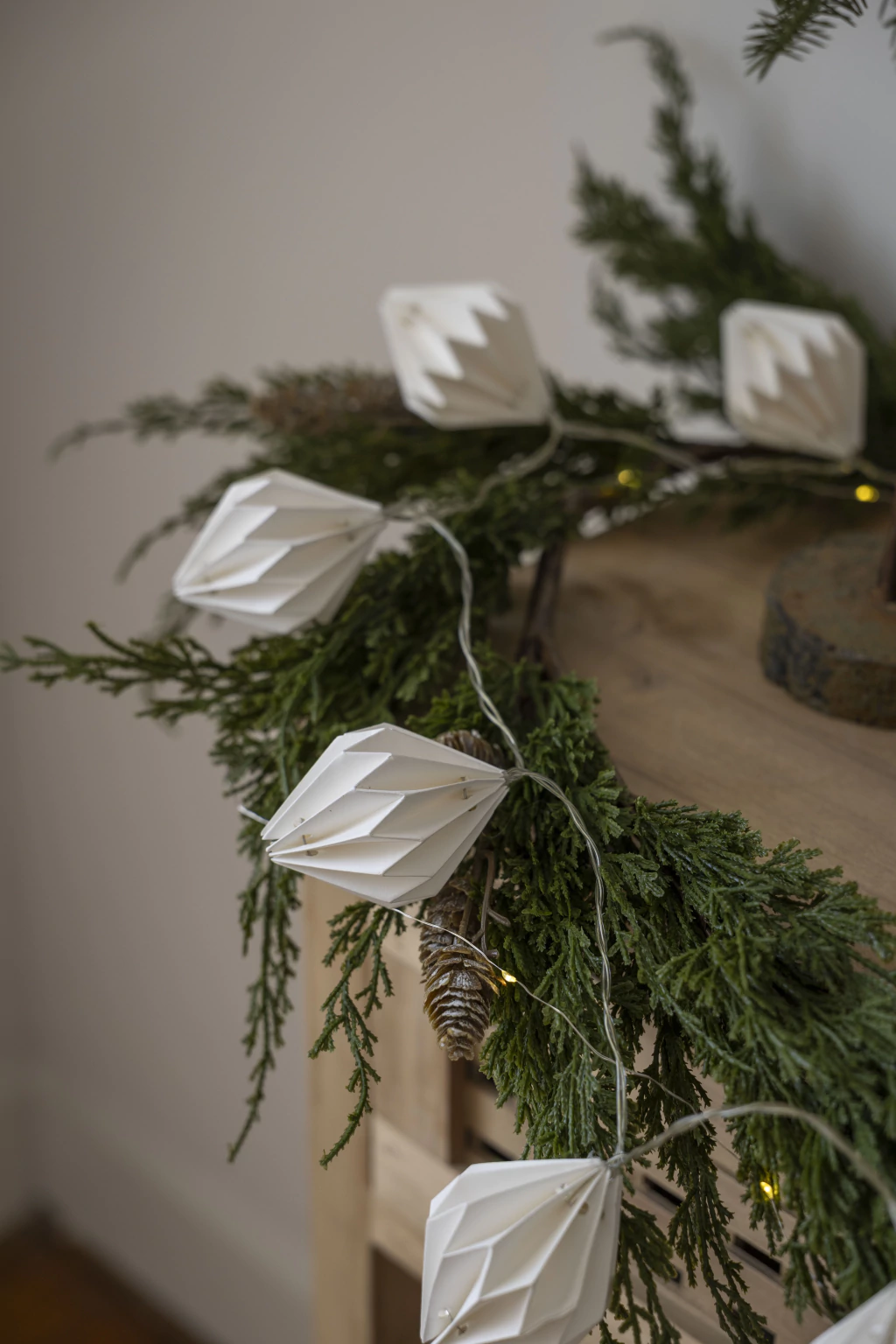 Guirnalda de luces led con rombos. Su iluminación suave crea una atmósfera cálida y acogedora, perfecta para decorar habitaciones, mesas festivas, ventanas o rincones especiales.
