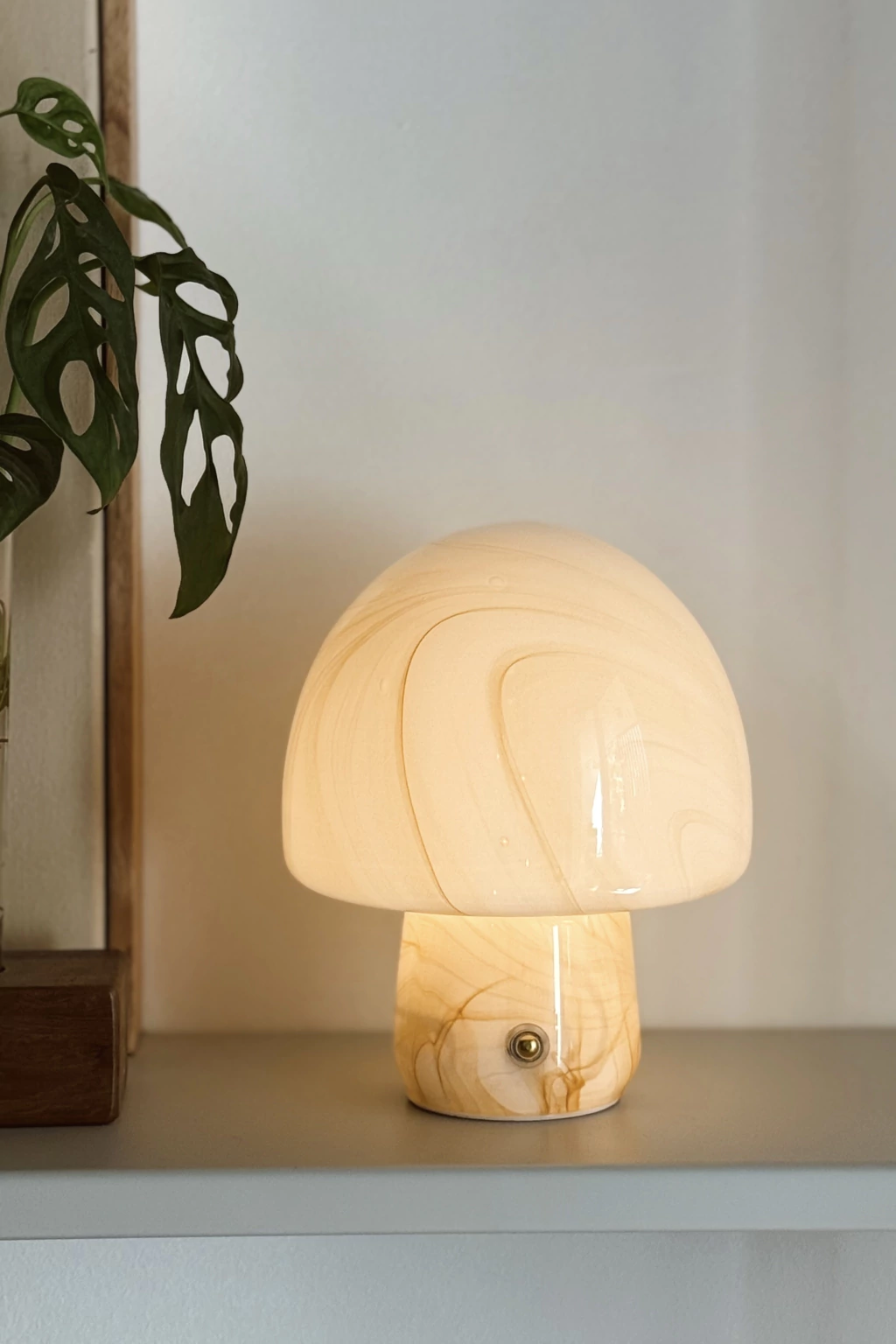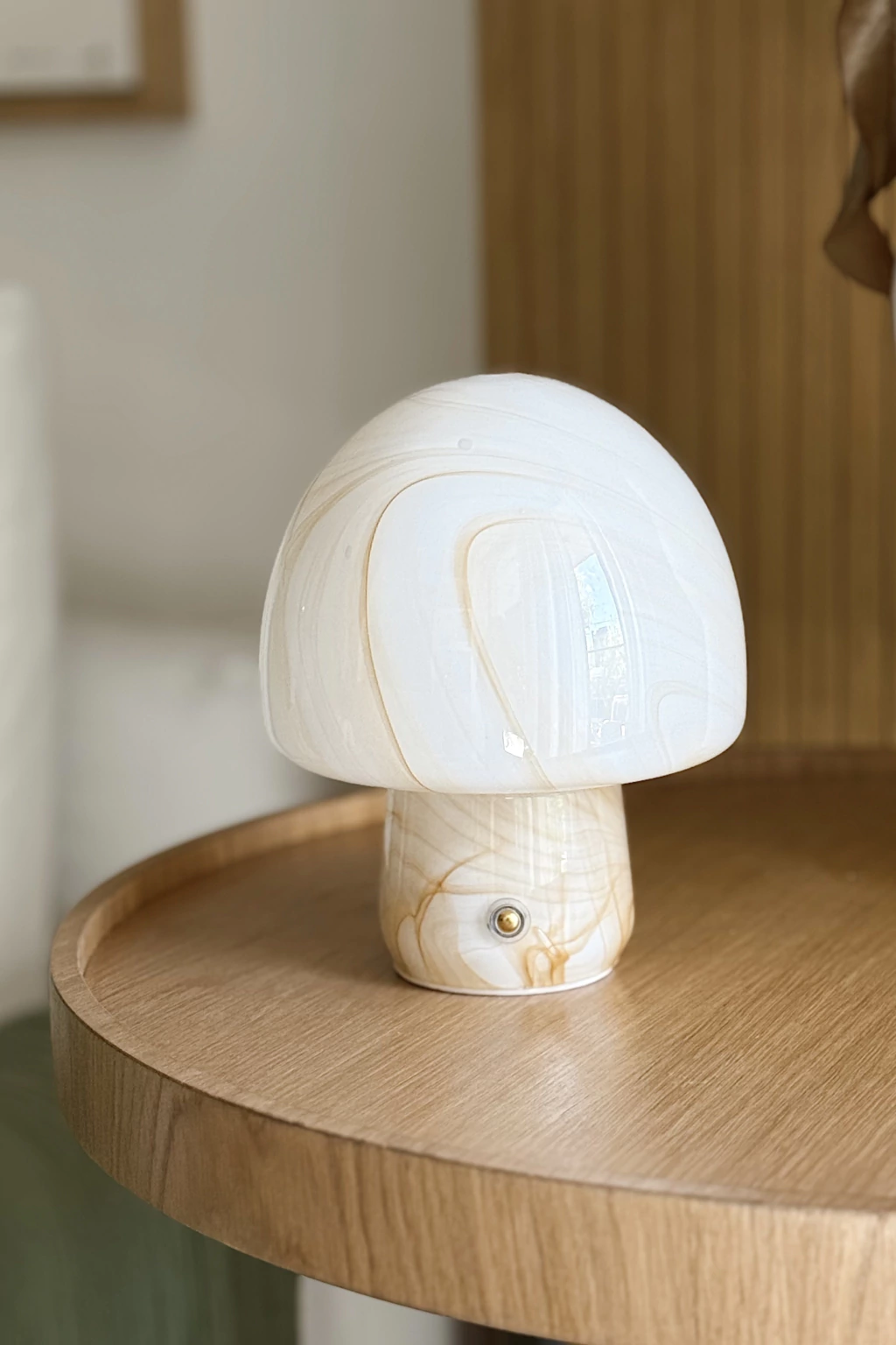 Lámpara LED inalámbrica con formato honguito, realizada en vidrio.