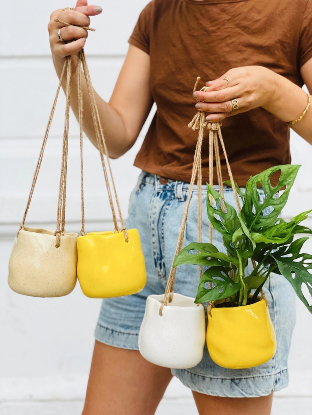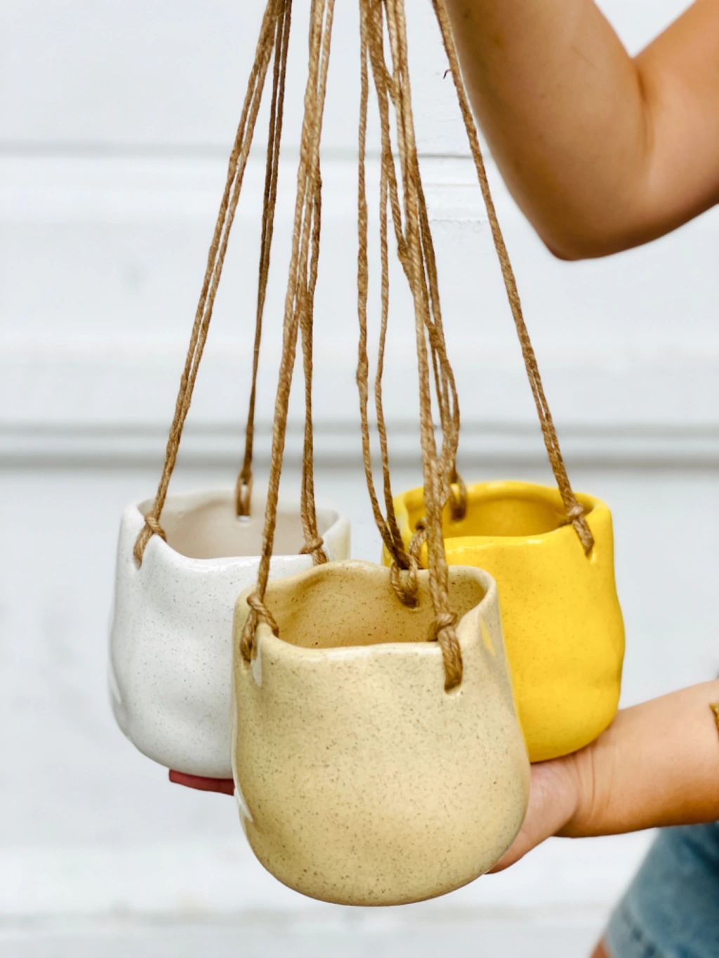 La Maceta Colgante Amorfa está realizada en cerámica con un formato orgánico y relajado que la hace única. Cuenta con colgante de hilo de yute y argolla metálica, que le aportan un aire natural y artesanal. Incluye orificio de drenaje y es ideal para interiores luminosos o exteriores techados, protegidos de la lluvia.