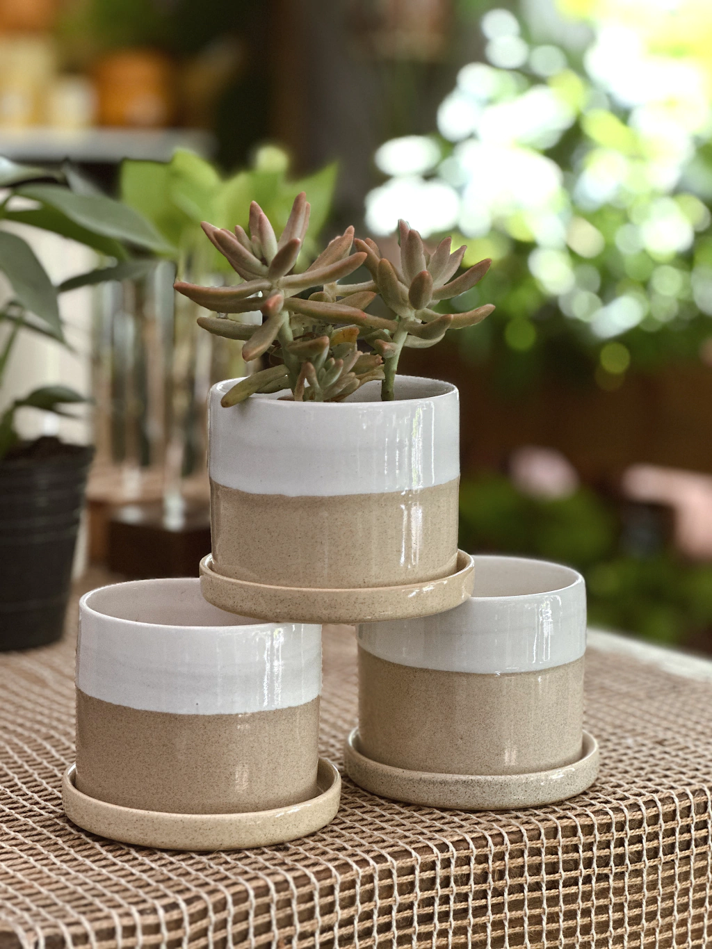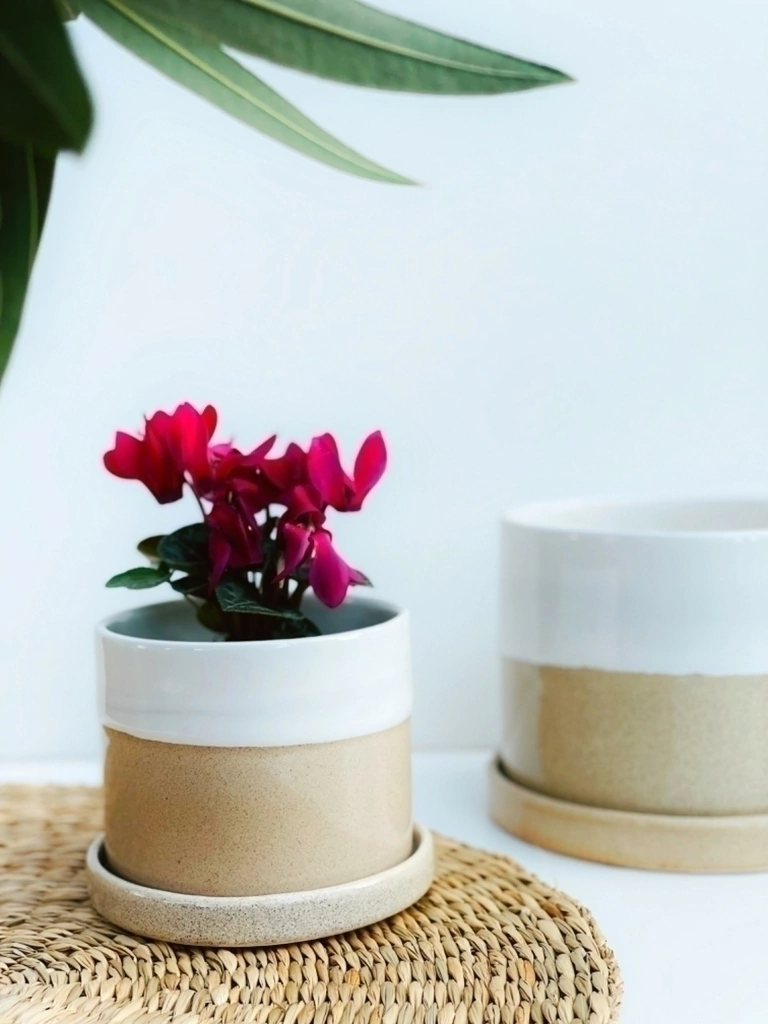La Maceta Arena Mini está realizada en cerámica esmaltada a mano, con un diseño cilíndrico y plato incluido. Cada pieza es única gracias a su esmaltado, inspirado en el efecto de la espuma y la arena de la playa. Incluye orificio de drenaje y resulta práctica para cuidar plantas pequeñas, evitando que el agua quede acumulada en la base.