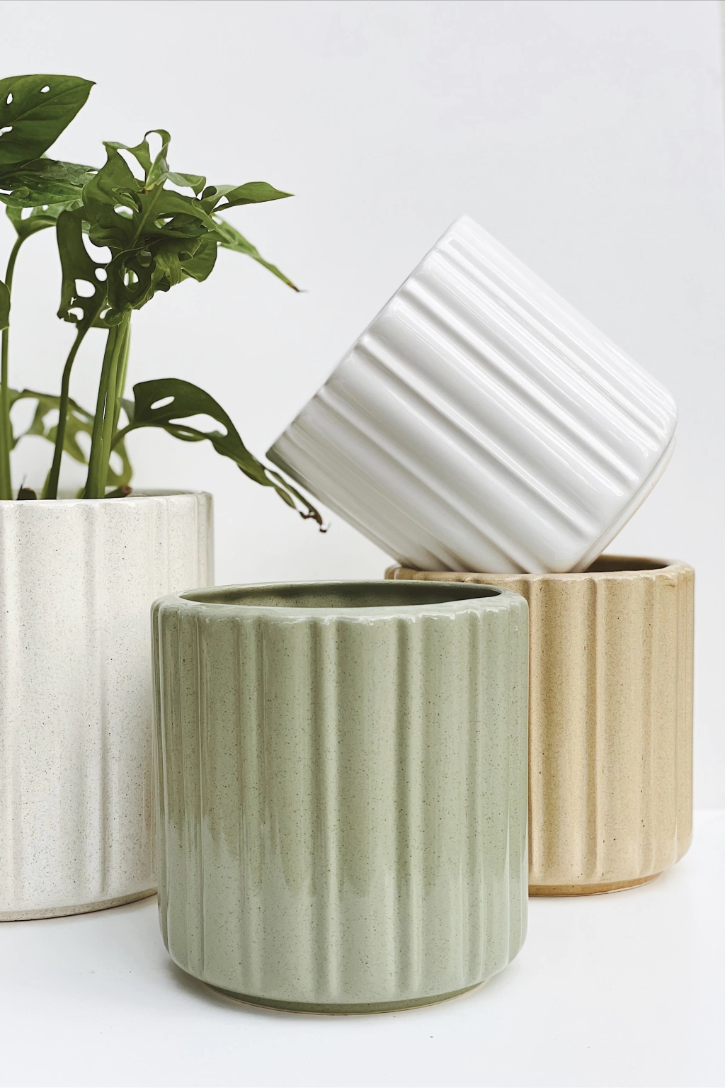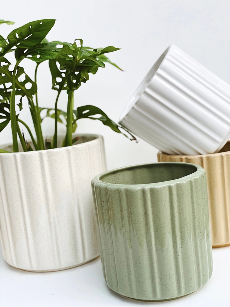 La Maceta Irma Chica está realizada en cerámica esmaltada, con un formato cilíndrico simple y versátil. Incluye orificio de drenaje y es una gran opción para plantas pequeñas o medianas de crecimiento lento, ideales para lucir en interiores como escritorios, mesas auxiliares o estantes.