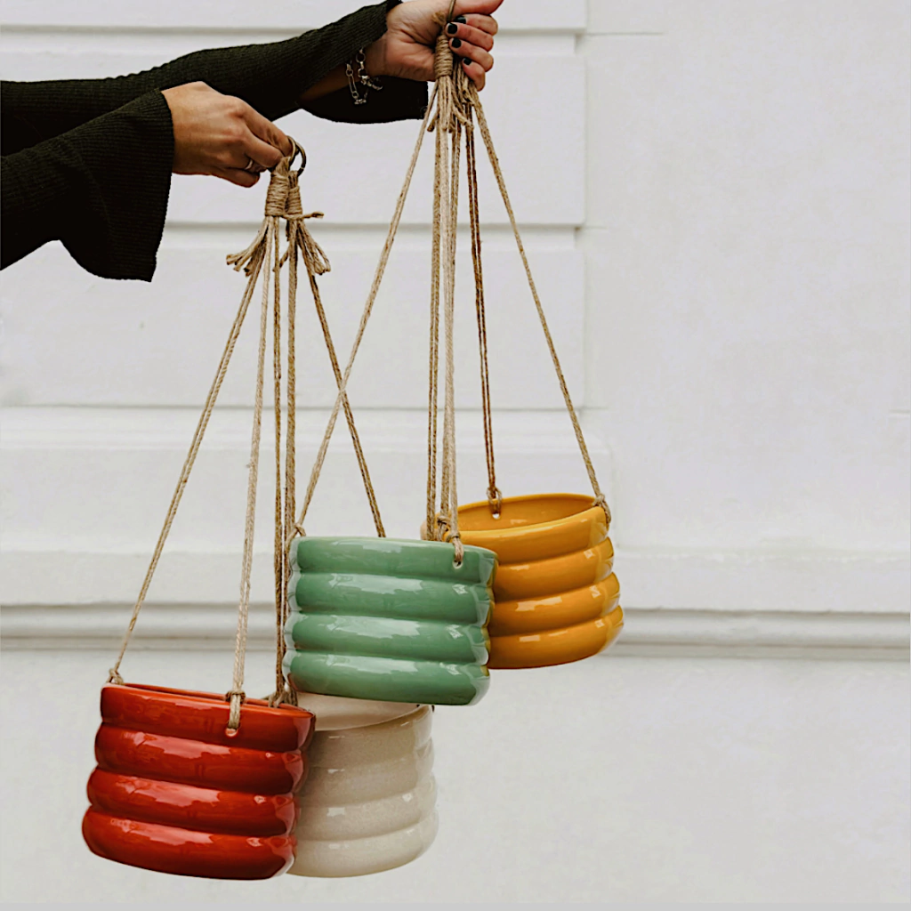 La Maceta Oruga Colgante está realizada en cerámica esmaltada con textura redondeada y acabado artesanal. Incluye orificio de drenaje y cuelga mediante hilo de yute con argolla metálica. Su diseño combina movimiento y color, ideal para sumar verde en altura y dar vida a balcones, galerías o interiores luminosos. Se recomienda plantar por debajo del hilo de yute para prolongar su durabilidad.