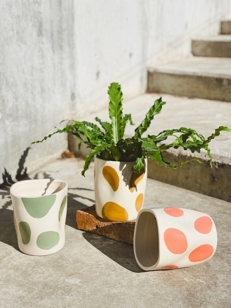 La Maceta Parches está realizada en cerámica esmaltada, con un efecto artesanal que combina parches de color en tonos ocre, salmón y verde. Cada pieza es única, ya que se confecciona a mano en torno sin molde, lo que le otorga un carácter auténtico y especial. Incluye orificio de drenaje para el cuidado de tus plantas.
