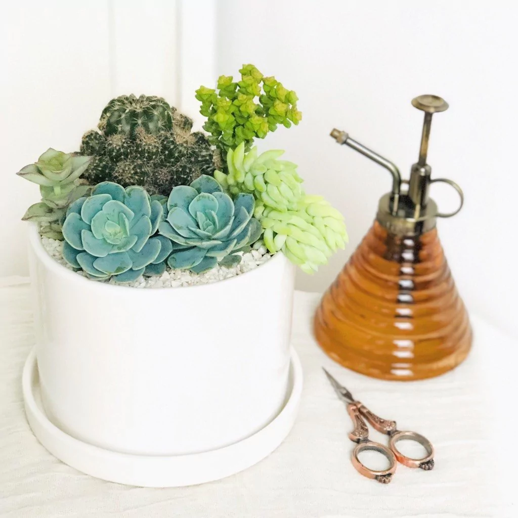 Mini jardín armado en nuestra maceta Eustaquio, una pieza de cerámica esmaltada a mano con formato cilíndrico y plato a tono. Incluye un mix de suculentas seleccionadas, ideales para quienes buscan una planta rústica, noble y de bajo mantenimiento. La maceta tiene drenaje y puede usarse en exteriores techados. Recomendamos no dejar agua acumulada en el plato para proteger la cerámica.