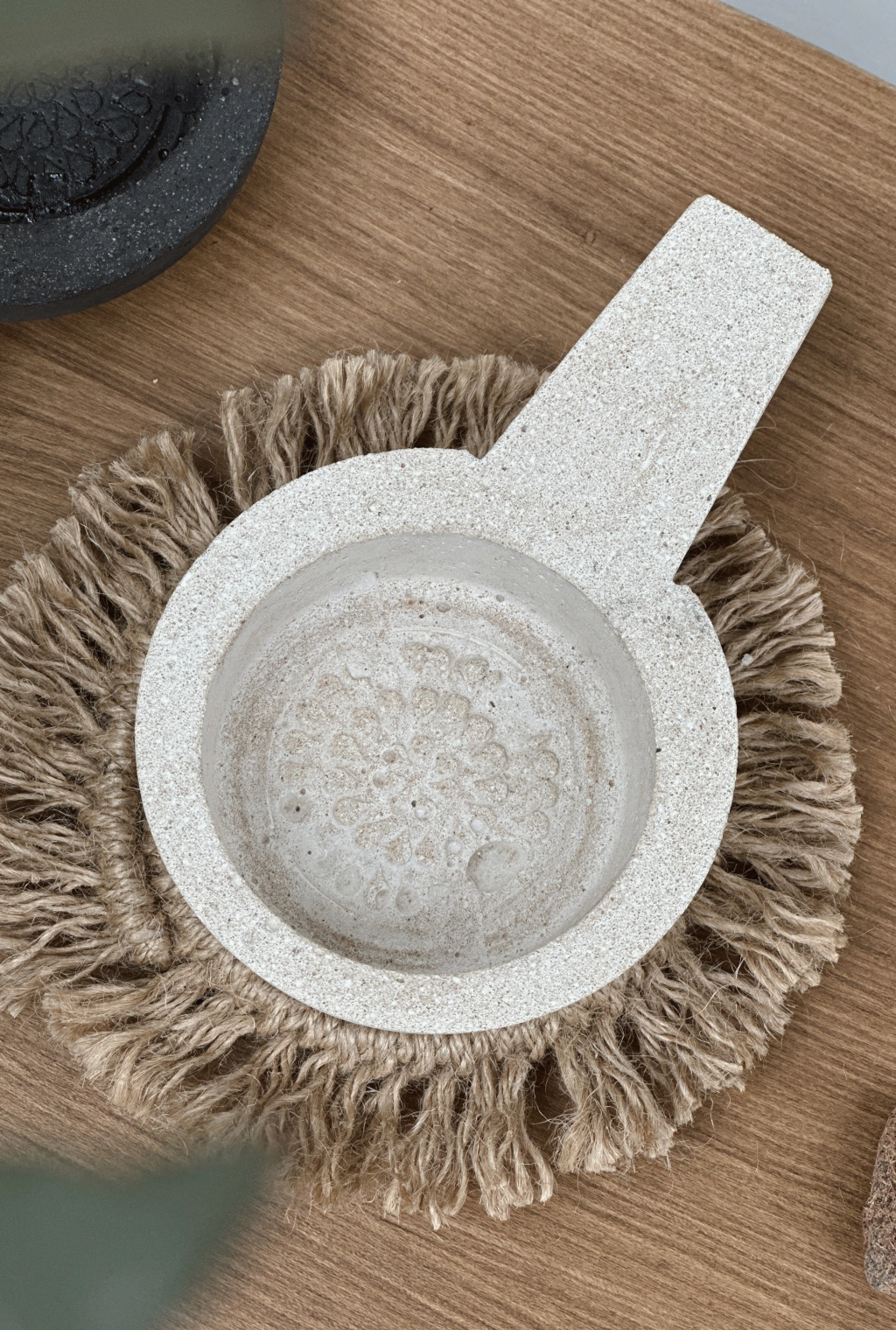 Sahumador realizado en cemento con textura y dibujo en su base. Podés conseguir las BOMBITAS SAHUMADORAS en nuestra sección de HERRAMIENTAS Y ACCESORIOS.