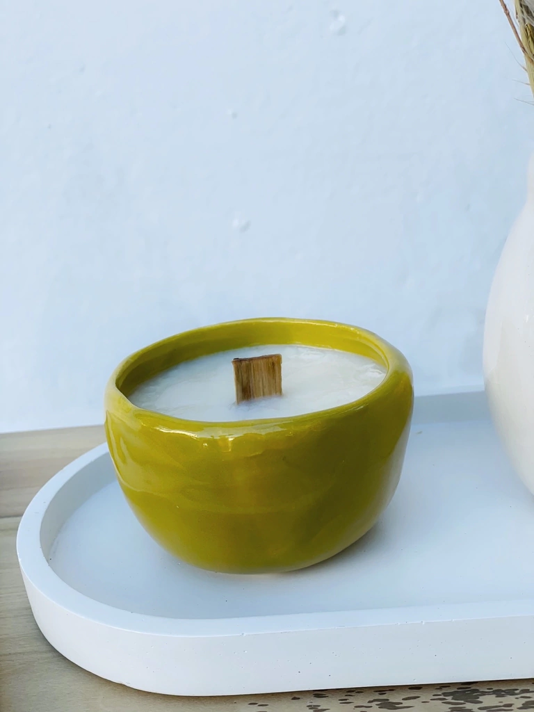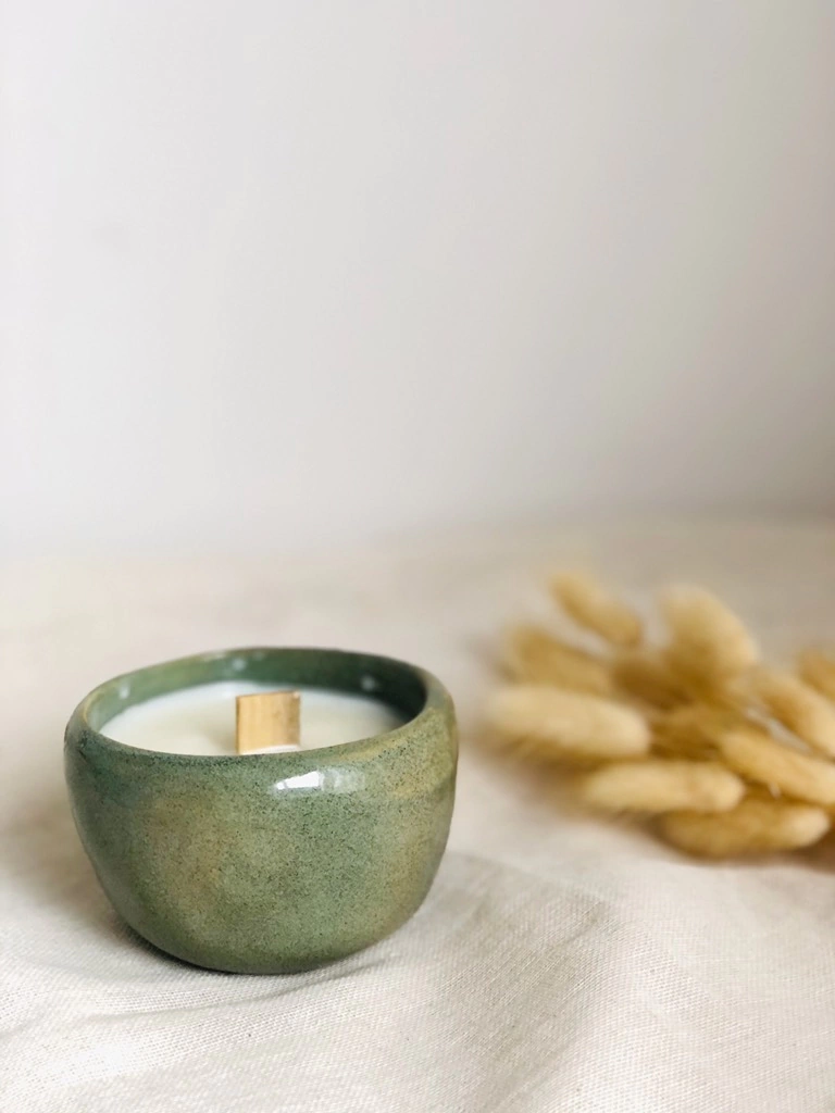Vela de cera de soja aromática en cuenco modelado a mano.