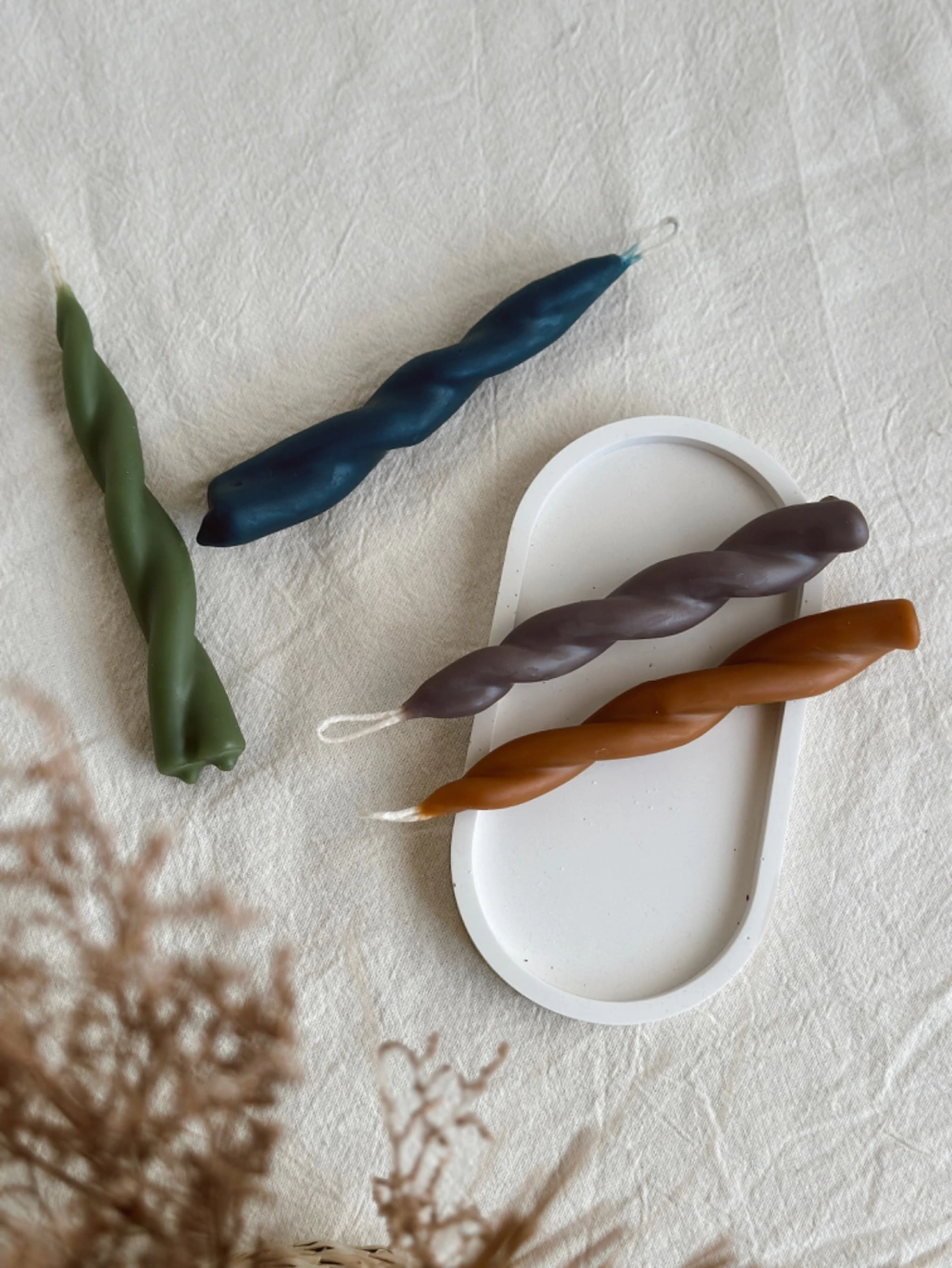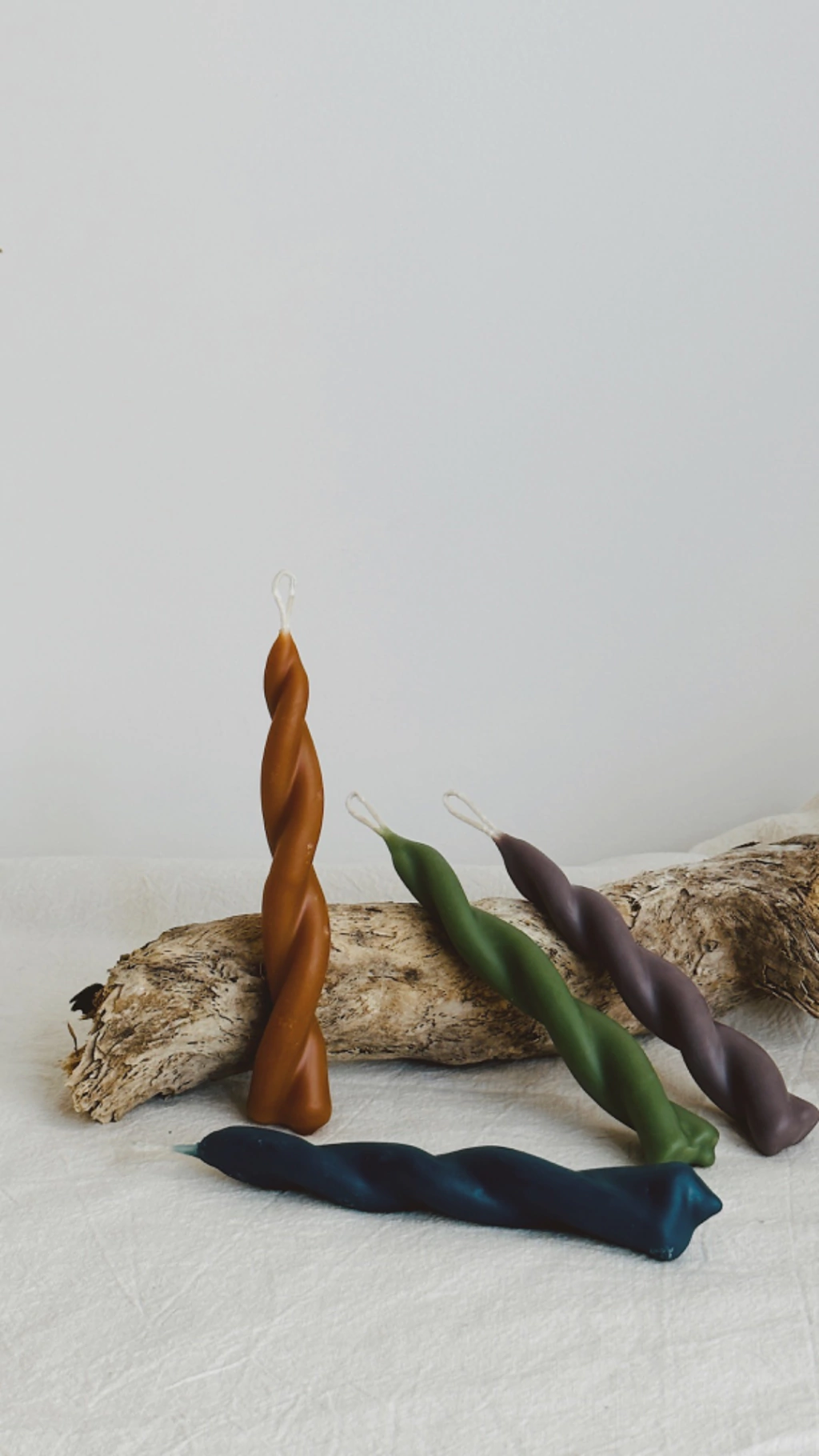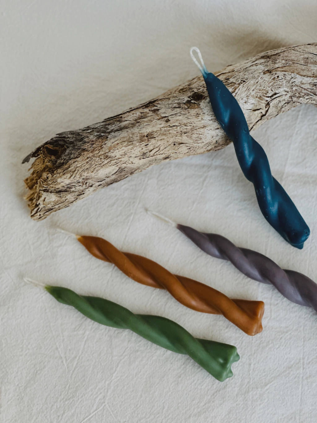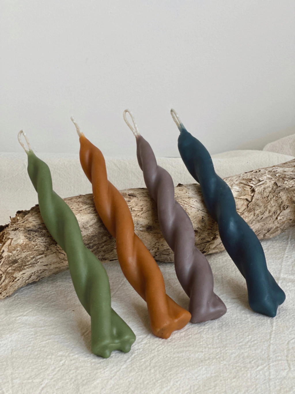 Velas realizadas en cera de abeja y cera de soja mediante el tradicional proceso de inmersión y modelado.
